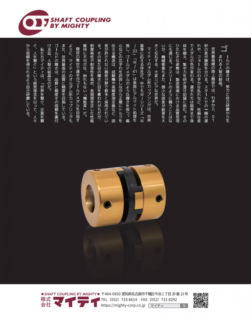 競技の舞台で選手がゴールドメダルを目指すように、マイティのオルダム形カップリングもまた、世界最高の品質と精度を目指している。ゴールドの輝きは、品質と精度その信頼を裏付ける証、人智の結晶なのだ。